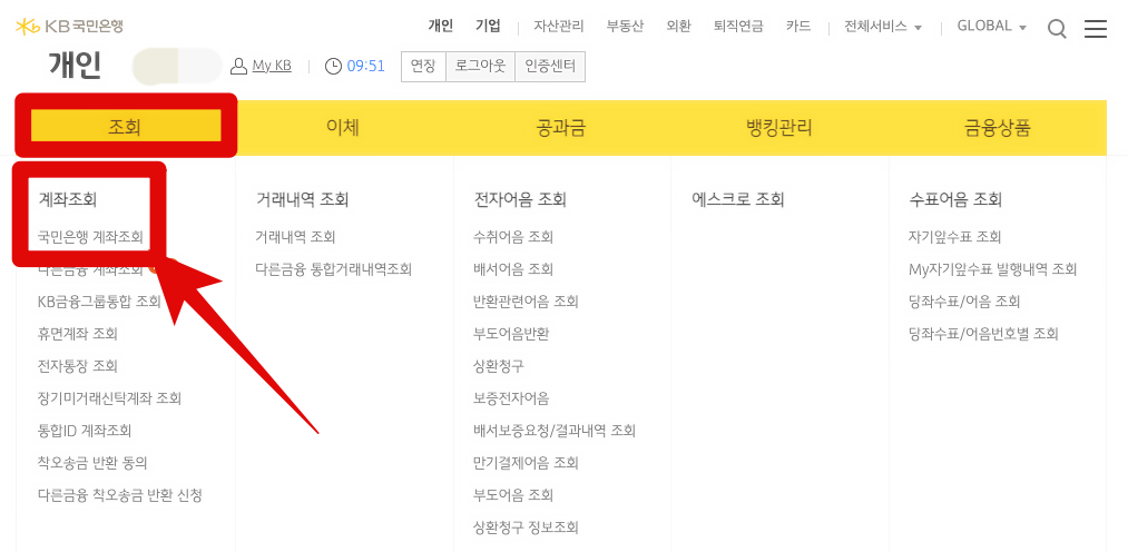 아래의 사진처럼 로그인 후 좌측 상단에 위치한 '조회' 메뉴에서 국민은행 계좌조회를 선택합니다. 계좌조회는 통합계좌 신청 시 타 은행도 모두 조회 가능합니다.